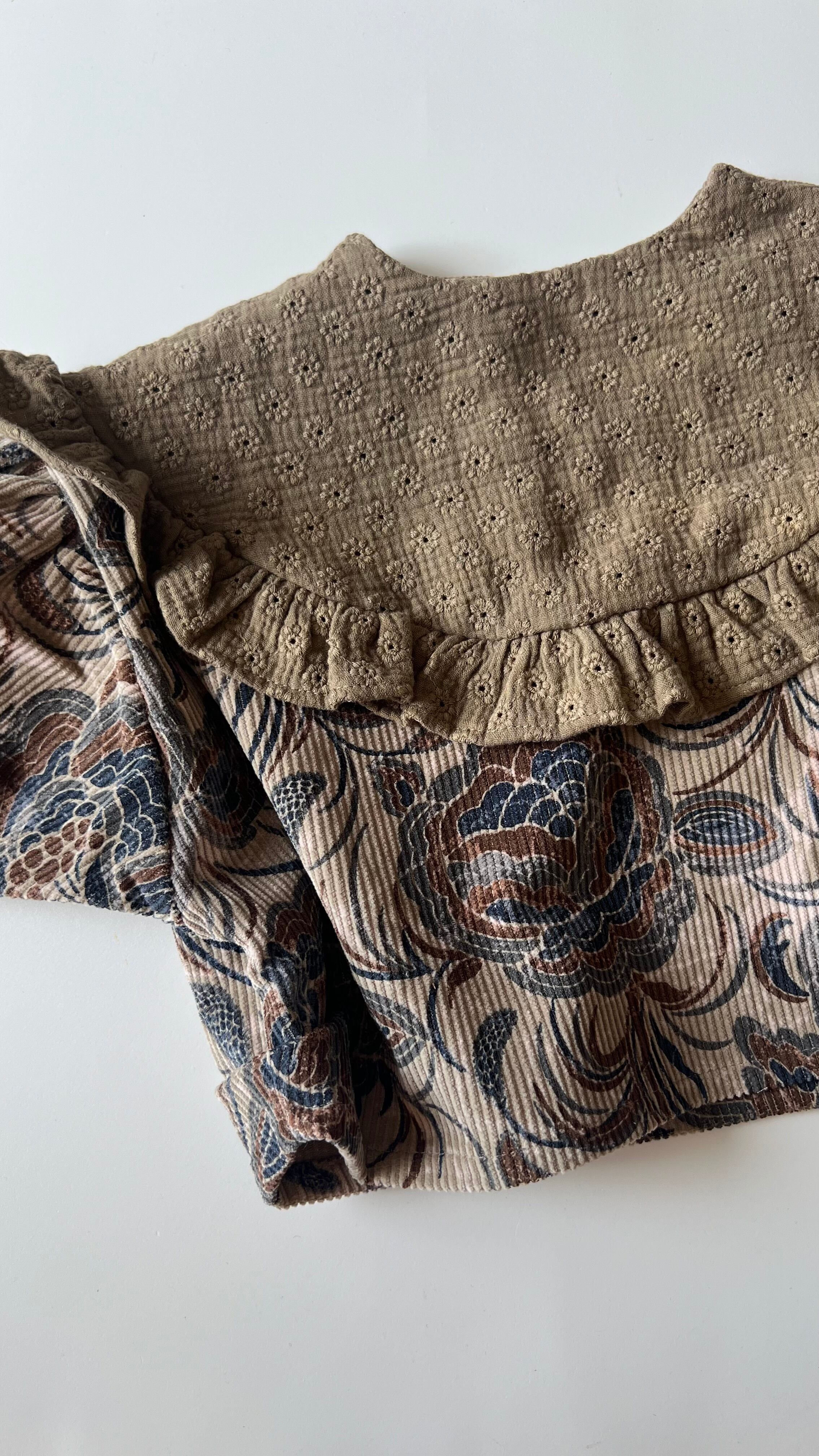 美しいコーデュロイと小さなお花の刺繍が施されたテキスタイルの