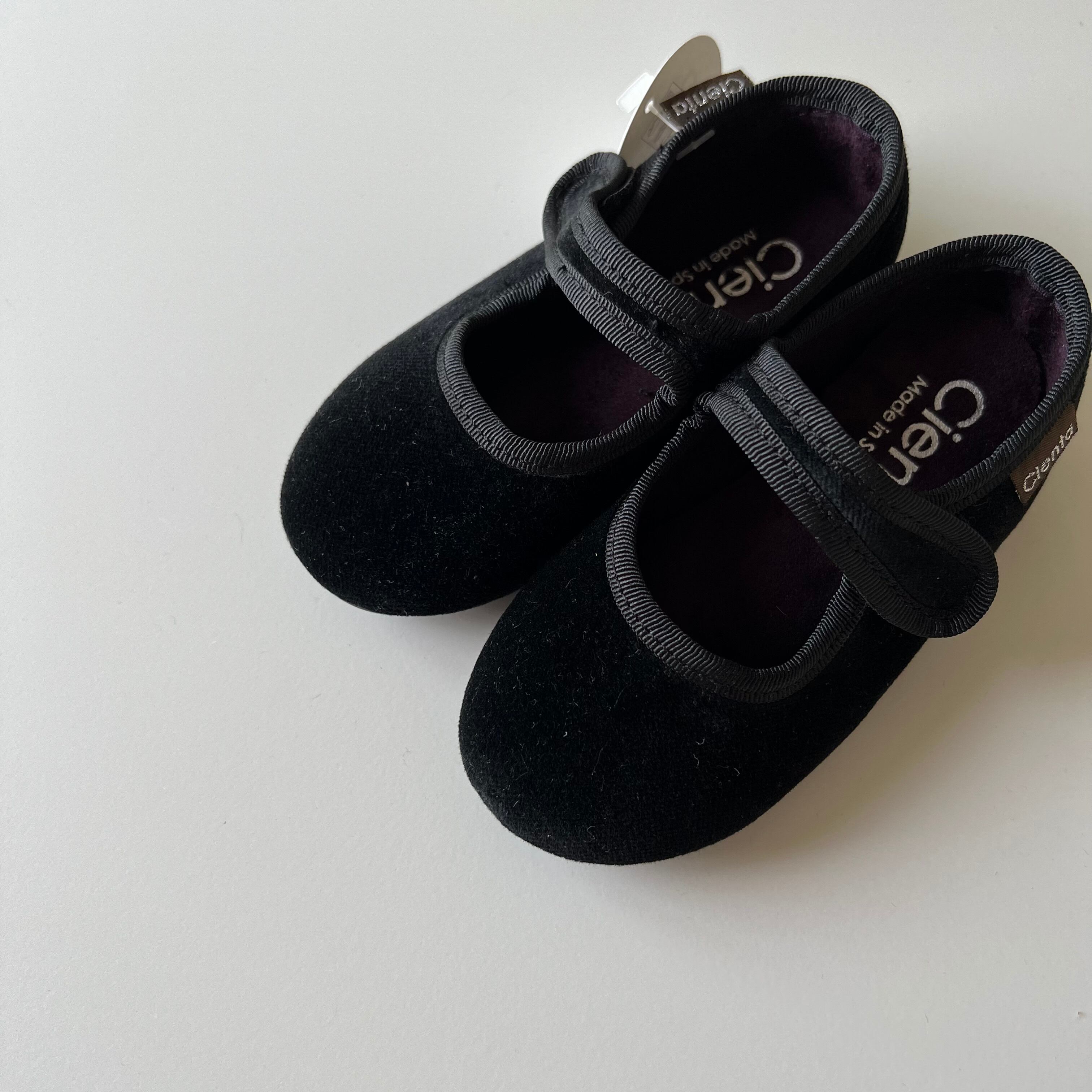 マジックテープで止められるベロア素材のシューズ。